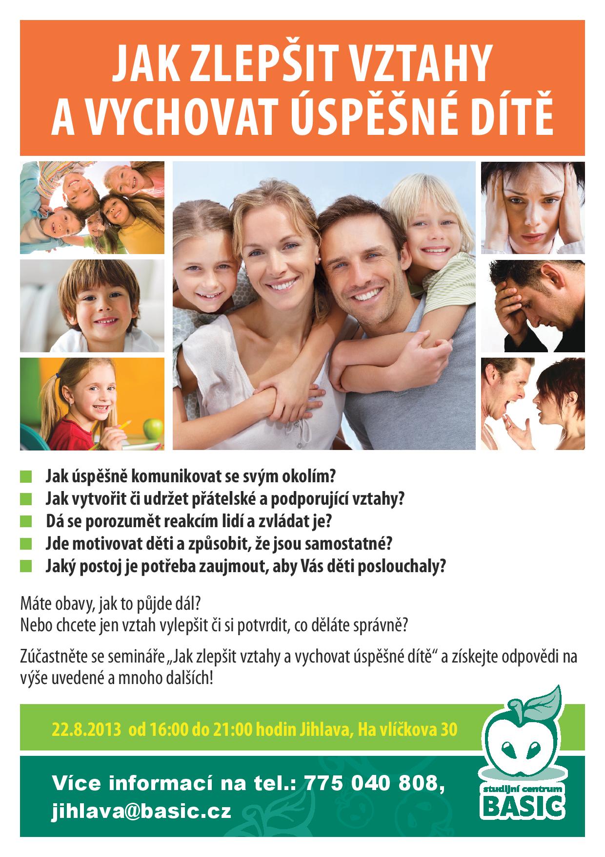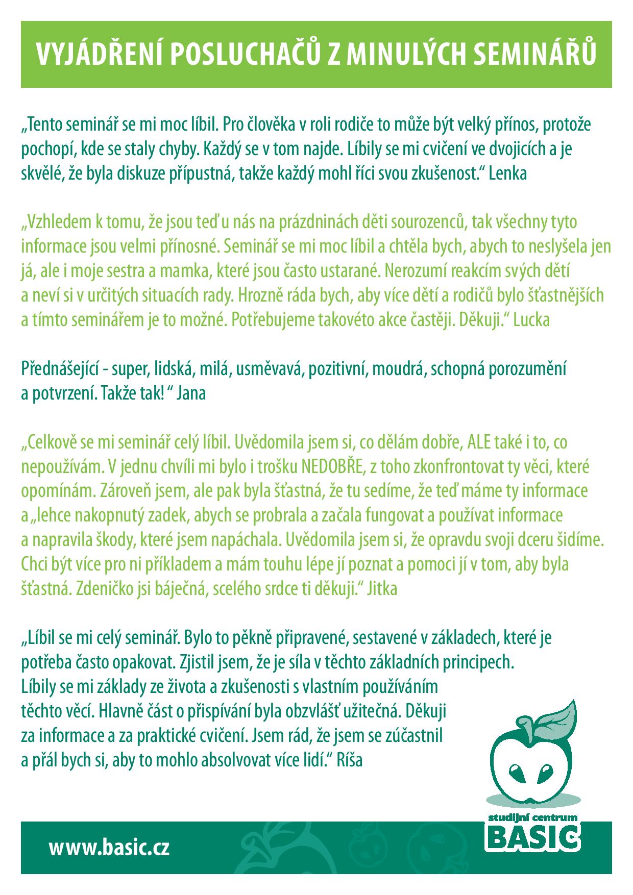 Jak úspěšně komunikovat se svým okolím? Jak vytvořit či udržet přátelské a podporující vztahy? Dá se porozumět reakcím lidí a zvládat je? Jde motivovat děti a způsobit, že jsou samostatné? Jaký postoj je potřeba zaujmout, aby Vás děti poslouchaly? Máte obavy, jak to půjde dál? Nebo chcete jen vztah vylepšit či si potvrdit, co děláte správně? Zúčastněte se semináře „Jak zlepšit vztahy a vychovat úspěšné dítě“ a získejte odpovědi na výše uvedené a mnoho dalších!  VYJÁDŘENÍ POSLUCHAČŮ Z MINULÝCH SEMINÁŘŮ „Tento seminář se mi moc líbil. Pro člověka v roli rodiče to může být velký přínos, protože pochopí, kde se staly chyby. Každý se v tom najde. Líbily se mi cvičení ve dvojicích a je skvělé, že byla diskuze přípustná, takže každý mohl říci svou zkušenost.“ Lenka „Vzhledem k tomu, že jsou teď u nás na prázdninách děti sourozenců, tak všechny tyto informace jsou velmi přínosné. Seminář se mi moc líbil a chtěla bych, abych to neslyšela jen já, ale i moje sestra a mamka, které jsou často ustarané. Nerozumí reakcím svých dětí a neví si v určitých situacích rady. Hrozně ráda bych, aby více dětí a rodičů bylo šťastnějších a tímto seminářem je to možné. Potřebujeme takovéto akce častěji. Děkuji.“ Lucka Přednášející - super, lidská, milá, usměvavá, pozitivní, moudrá, schopná porozumění a potvrzení. Takže tak! “ Jana „Celkově se mi seminář celý líbil. Uvědomila jsem si, co dělám dobře, ALE také i to, co nepoužívám. V jednu chvíli mi bylo i trošku NEDOBŘE, z toho zkonfrontovat ty věci, které opomínám. Zároveň jsem, ale pak byla šťastná, že tu sedíme, že teď máme ty informace a „lehce nakopnutý zadek, abych se probrala a začala fungovat a používat informace a napravila škody, které jsem napáchala. Uvědomila jsem si, že opravdu svoji dceru šidíme. Chci být více pro ni příkladem a mám touhu lépe jí poznat a pomoci jí v tom, aby byla šťastná. Zdeničko jsi báječná, scelého srdce ti děkuji.“ Jitka „Líbil se mi celý seminář. Bylo to pěkně připravené, sestavené v základech, které je potřeba často opakovat. Zjistil jsem, že je síla v těchto základních principech. Líbily se mi základy ze života a zkušenosti s vlastním používáním těchto věcí. Hlavně část o přispívání byla obzvlášť užitečná. Děkuji za informace a za praktické cvičení. Jsem rád, že jsem se zúčastnil a přál bych si, aby to mohlo absolvovat více lidí.“ Ríša www.basic.cz
