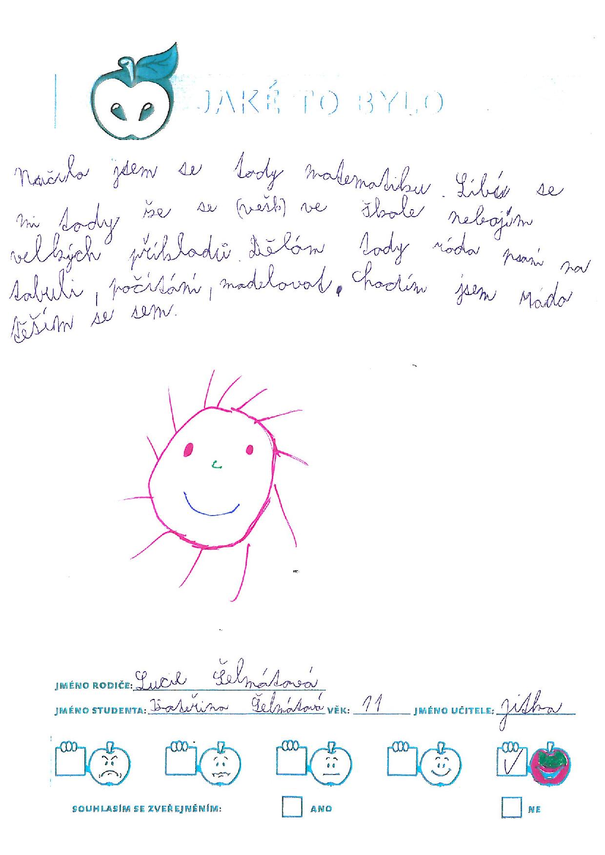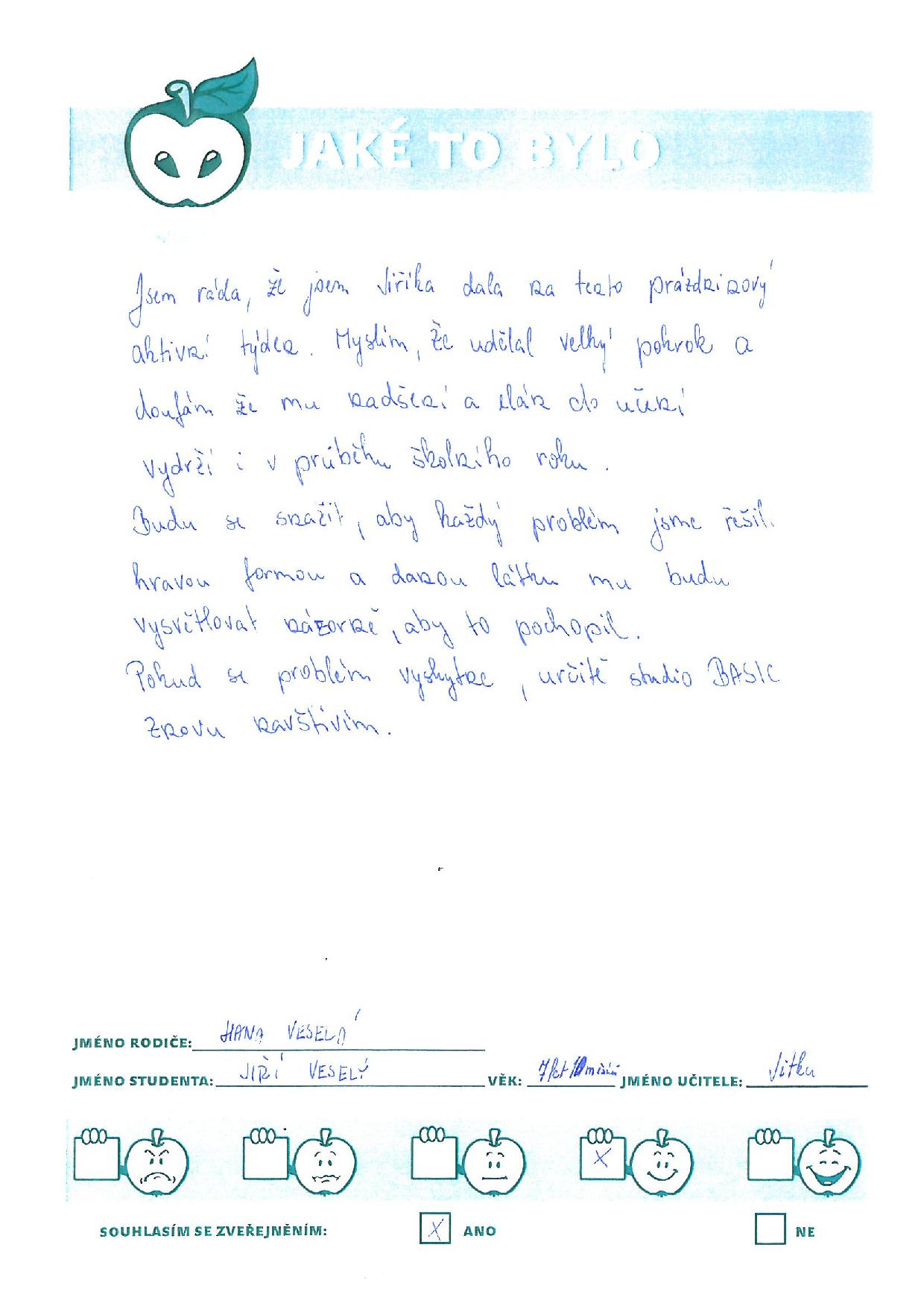 Jsem ráda, že jsem Jiříka dala na tato prázdninový aktiva týdne. Myslím, že udělal velký pokrok a doufám, že mu nadšení a elán do učení vydrží i v průběhu školního roku. Budu se snažit, aby každý problém jsme řešily hravou formou a danou látku mu budu vysvětlovat názorně, aby to pochopil. Pokud se problém vyskytne, určitě studio BASIC znovu navštívím. Maminka H. V.