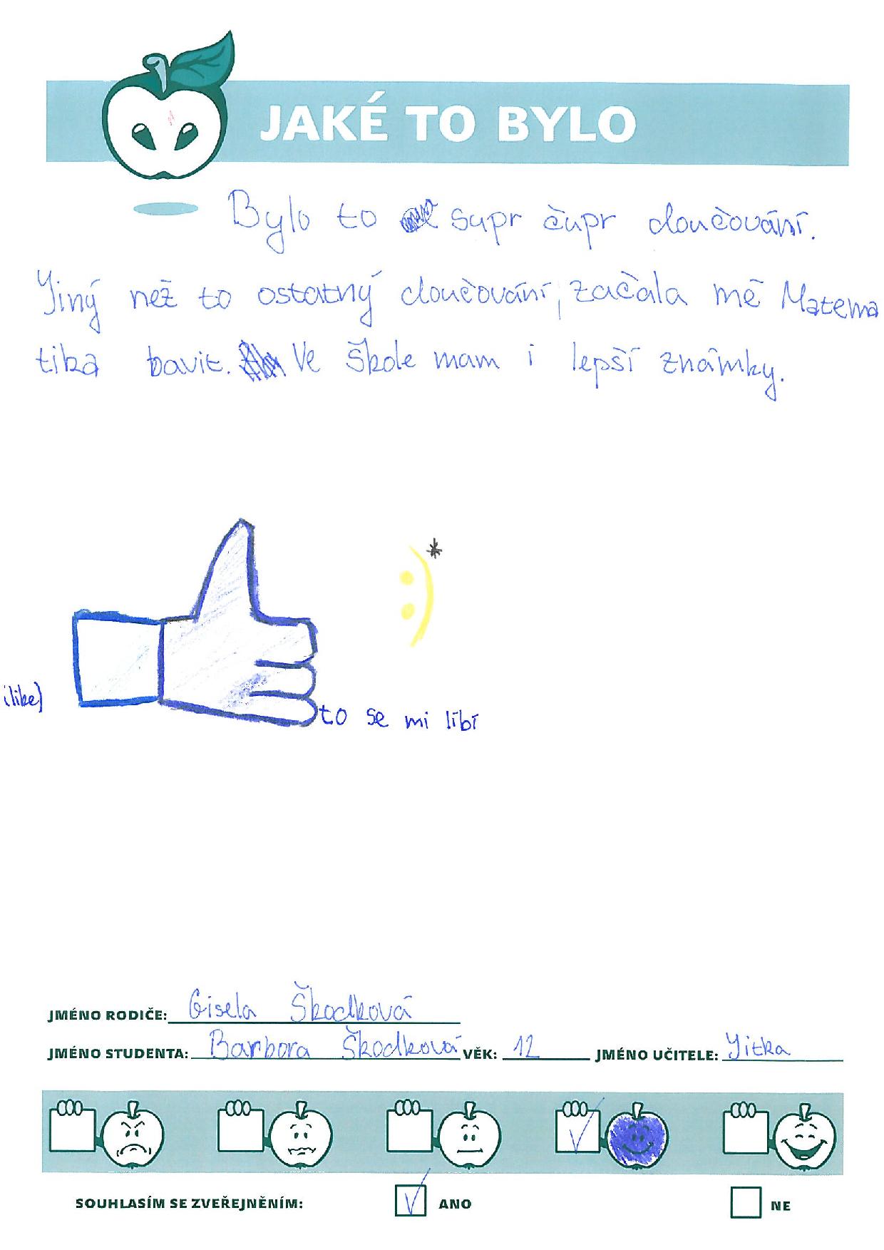 Bylo to supr čupr doučování. Jiný než to ostatní doučování, začala mě matematika bavit. Ve škole mám i lepší známky. Barča