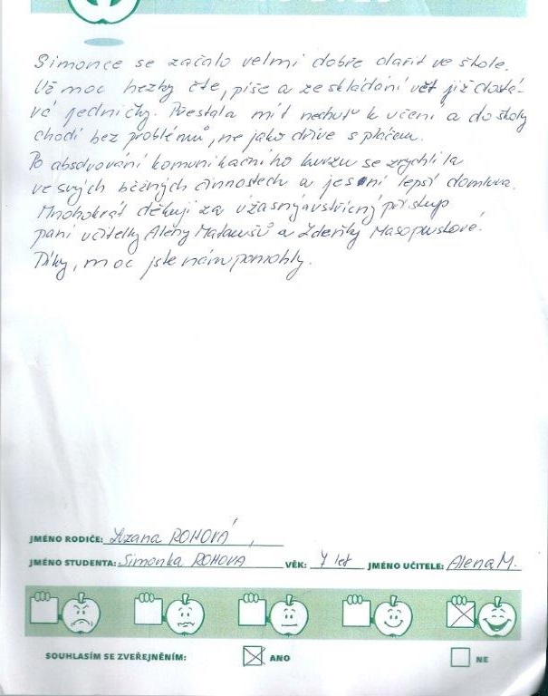 Simonce se začalo velmi dobře dařit ve škole. Už moc hezky čte, píše a ze skládání vět již dostává jedničky. Přestala mít nechuť k učení a do školy chodí bez problémů, ne jako dřív s pláčem. Po absolvování komunikačního kurzu se zrychlila ve svých běžných činnostech a je s ní lepší domluva. Mnohokrát děkuji za úžasný vstřícný přístup paní učitelky Aleny Matoušové a Zdeňky Masopustové. Díky, moc jste nám pomohly.