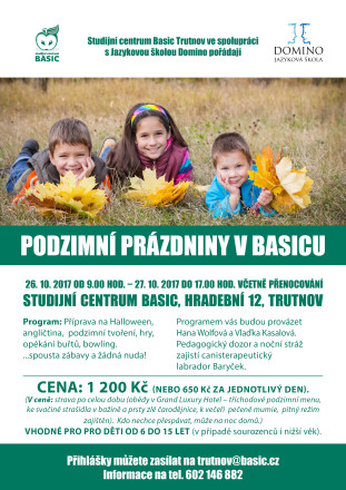 Podzimní prázdniny v BASICu se konají 26. 10. od 9:00 hodin do 27. 10. do 17:00 hodin v Hradební ulici 12 v Trutnově.