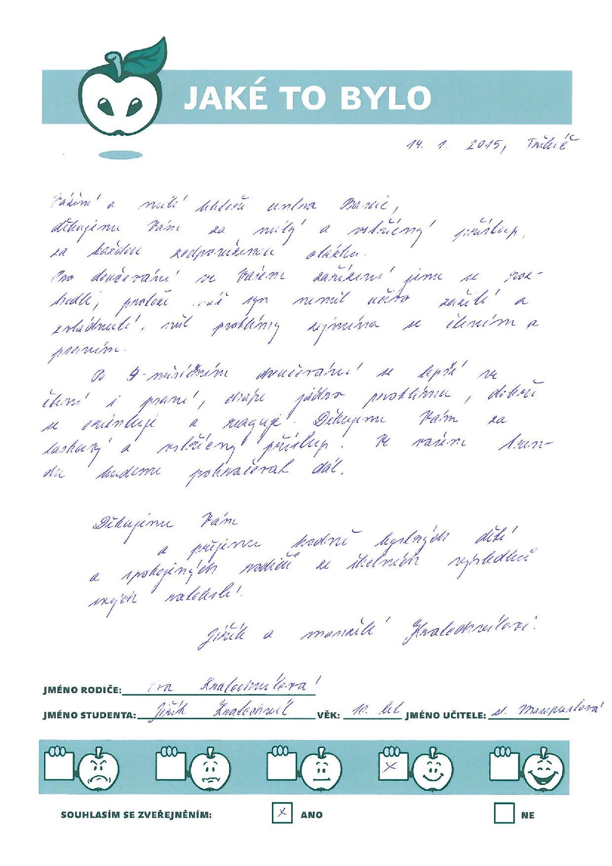 Po 4 měsíční doučování se lepší ve čtení i psaní, chápe jádro problému, dobře se orientuje a reaguje. Děkujeme Vám za laskavý a vstřícný přístup. Ve vašem duchu budeme pokračovat dál.
