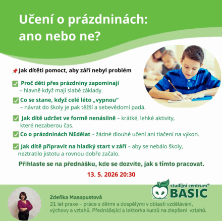 Přihlášením přes formulář je potřeba zadat vaše jméno a e-mail. Do zprávy nám napište, že máte zájem o přednášku „Učení o prázdninách“. My vám poté na e-mail zašleme odkaz k přihlášení.