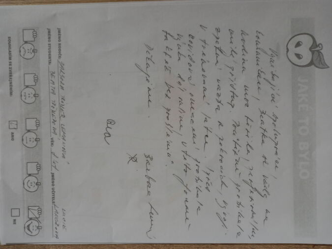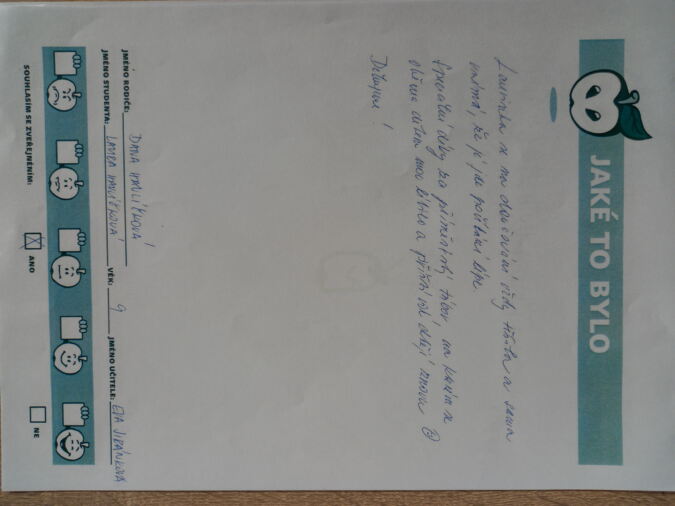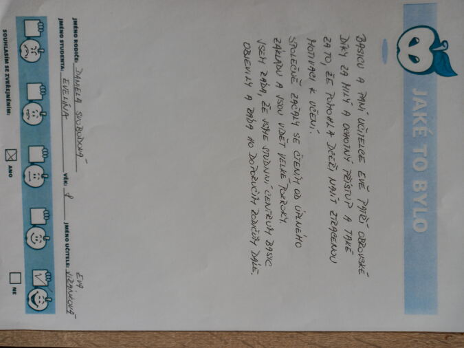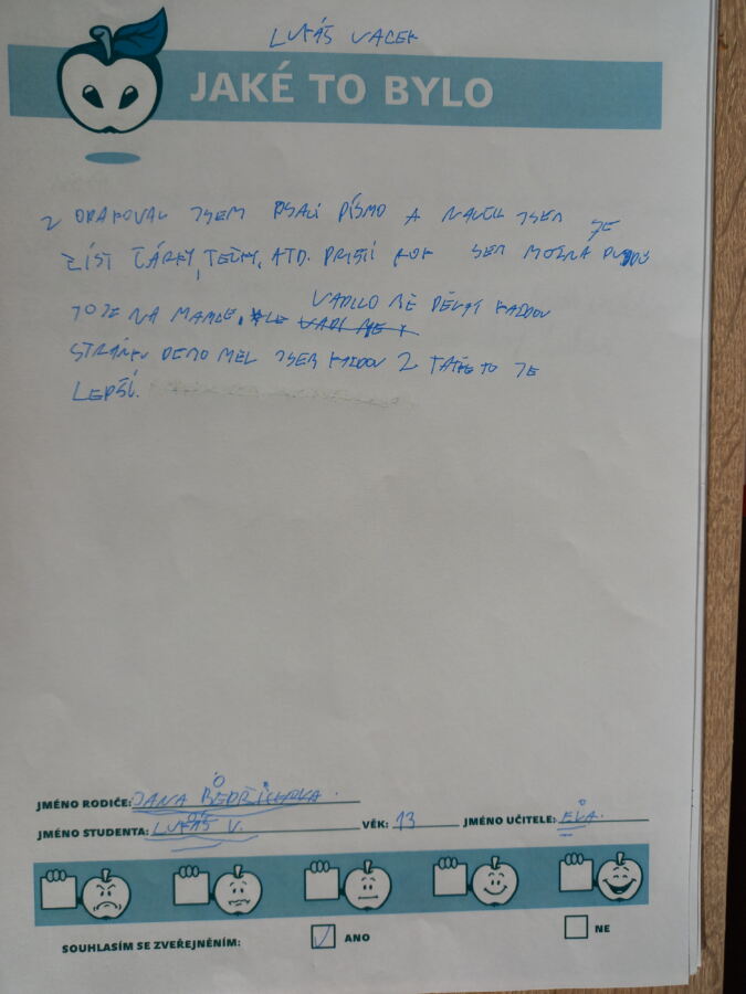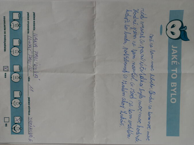 „Mně se tam moc líbilo. Budu se tam moc moc rád vracet a paní učitelka byla moc moc hodná. Hodně jsem se tam naučil a rád se tam vrátím, když to budu potřebovat a zatím ahoj, Lukáš.“