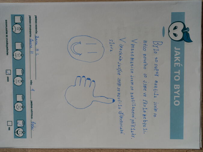 „Bylo to super, naučila jsem se něco nového, co jsme ve škole nebrali. V matematice jsem se naučila nové příklady. V českém jazyce jsem se naučila vyjmenovaná slova.“